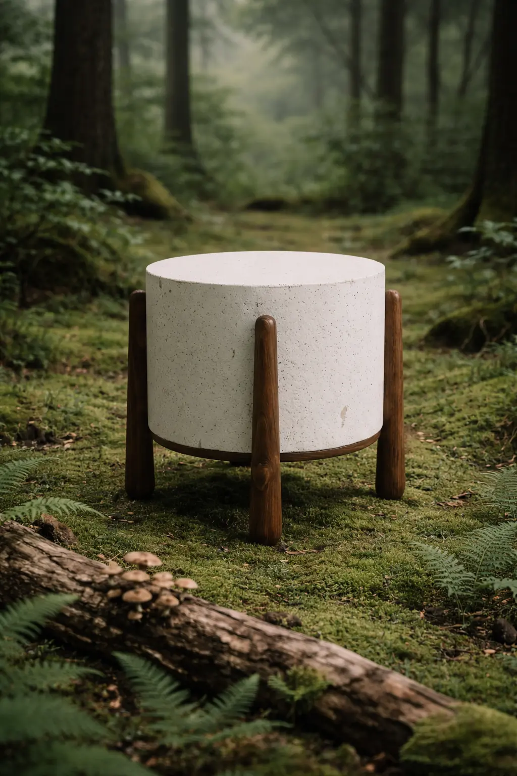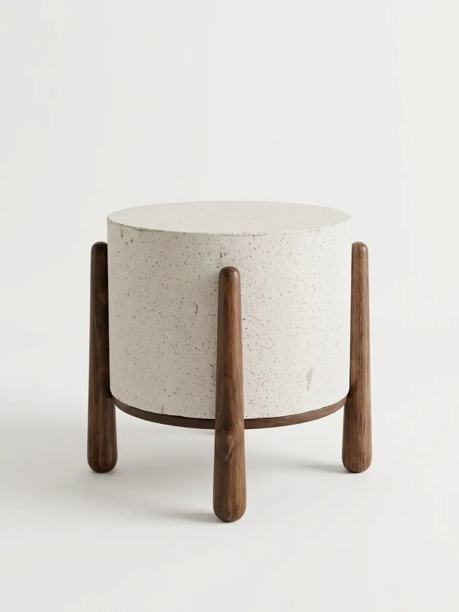 O resultado é uma peça autoral que une inovação material e marcenaria artesanal, equilibrando o aspecto orgânico do cilindro com a precisão da madeira torneada.